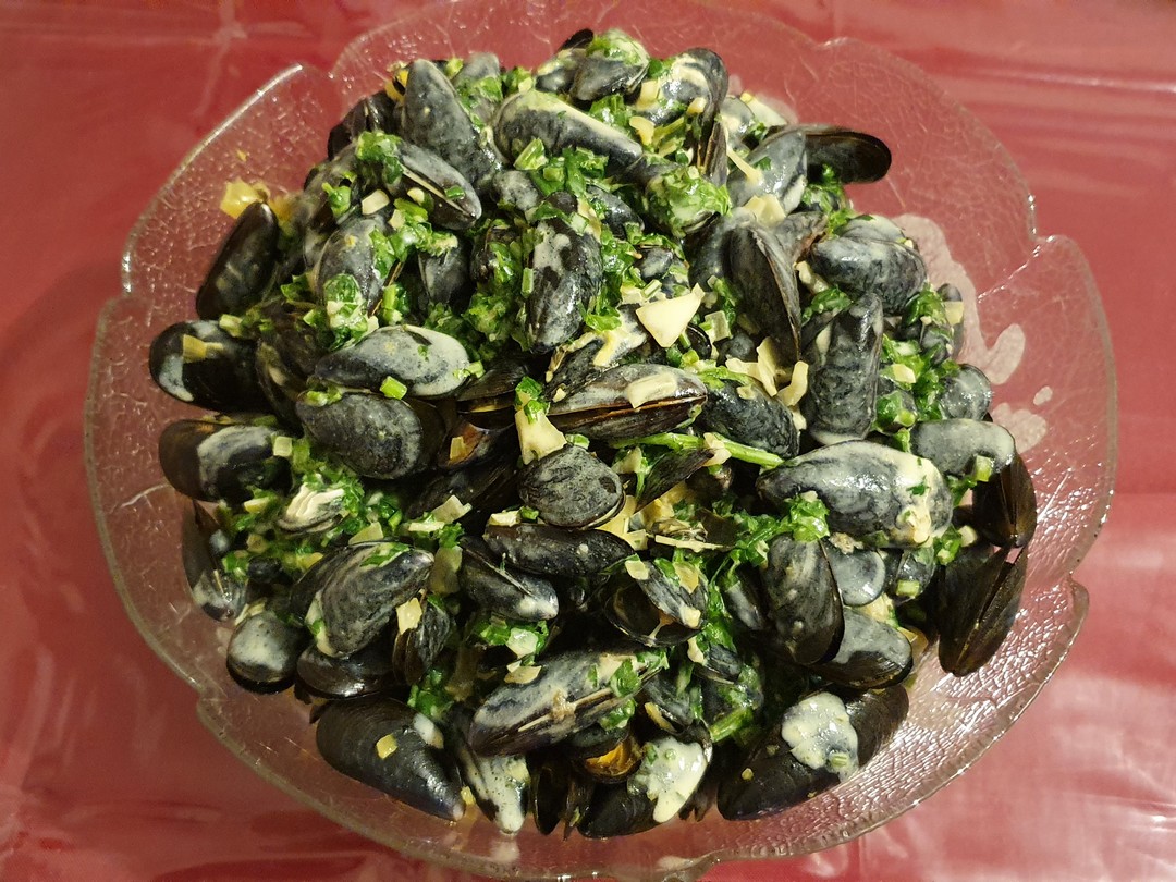 Moules cuites dans leur jus de cuisson additionné de vin blanc et aromatisé aux fines herbes.