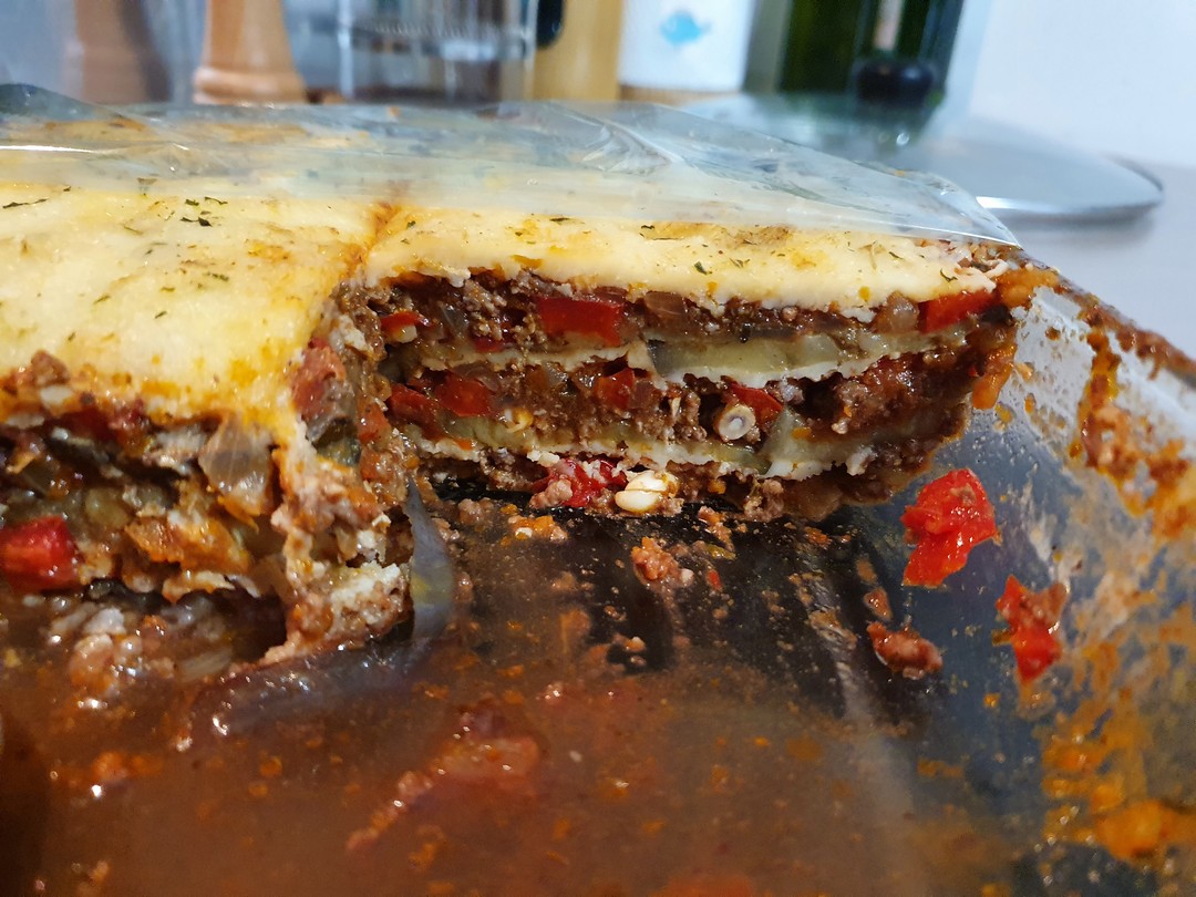 Plat fait de tranches d'aubergines frites, disposées en couches alternées avec un hachis de mouton et d'oignons, et cuit au four.