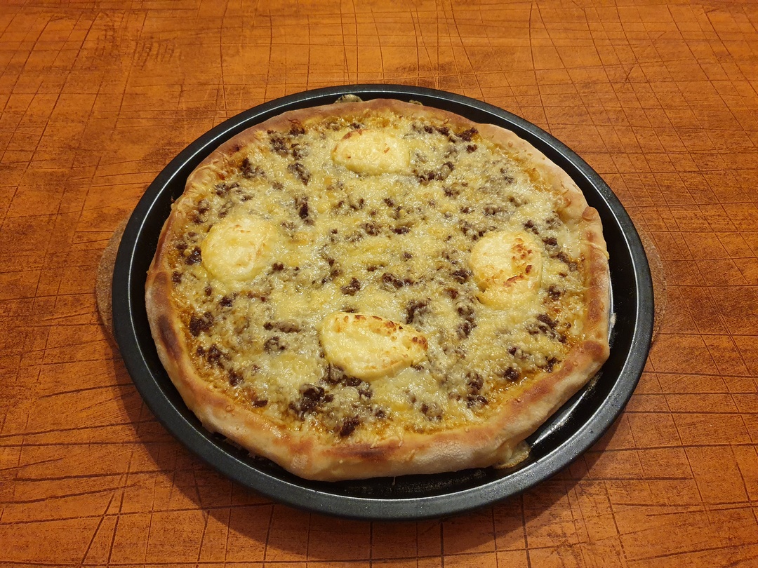 Galette italienne en pâte à pain garnie de mozzarelle, de tomates, d'anchois, d'olives, etc.