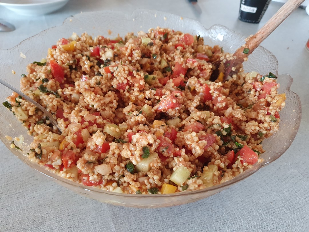 Mélange de blé concassé et d'un fin hachis de tomates, de persil, d'oignons et de feuilles de menthe, arrosé d'huile d'olive et de jus de citron. (Cuisine libanaise.)