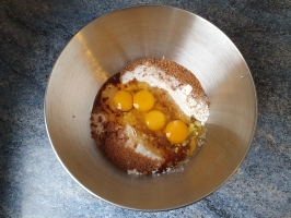 Tamiser la farine et la mélanger avec le sucre et le sel, faire un puit et y déposer les œufs, mélanger.