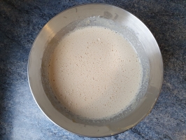 Incorporer le lait et fouetter au fur et à mesure la préparation jusqu'à ce que le mélange soit bien homogène, sans grumeaux.
