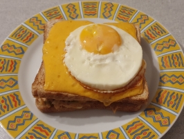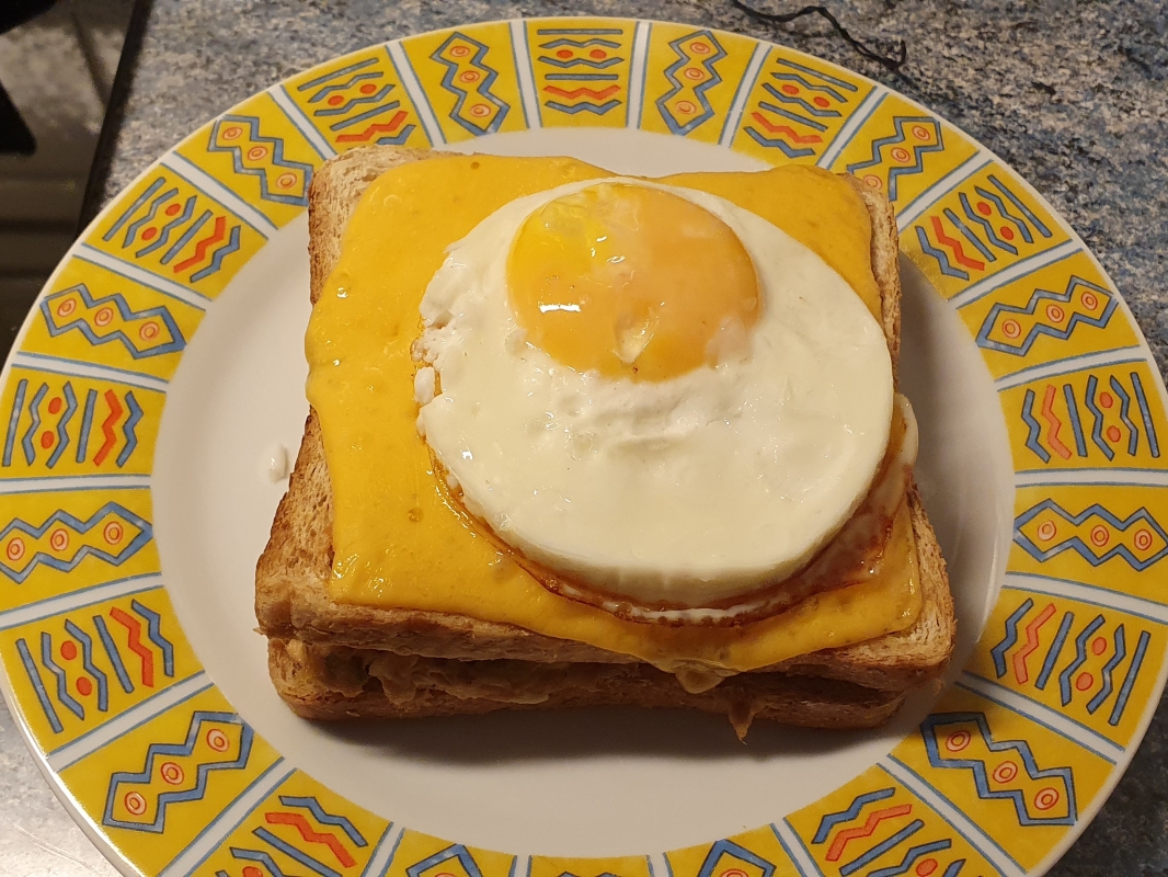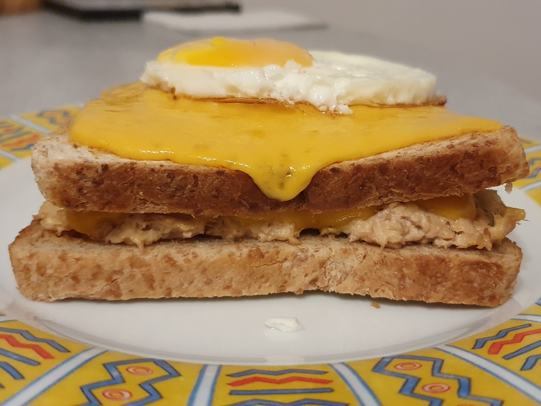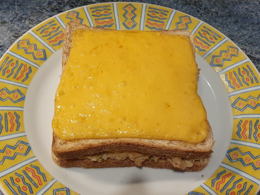 Faire toaster 2 tranches de pain de mie préalablement tartiné d'huile de coco sur une seule face. Tartiner une tranche de pain avec le mélange. Recouvrir de 2 tranches de fromage. Sur l'autre tranche de pain ajouter une tranche de fromage. Faire fondre au grill du four quelques minutes.