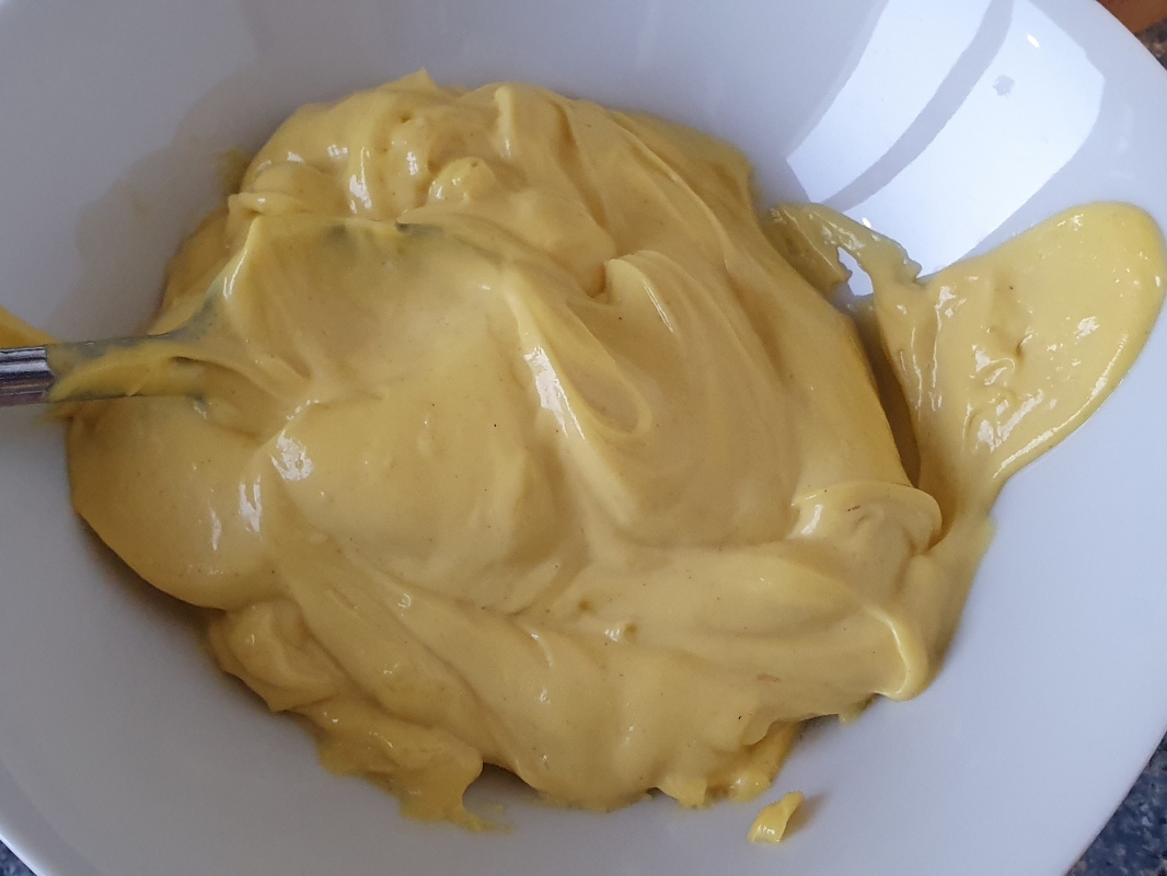 Mélanger le jaune d'œuf, la moutarde et l'huile en ajoutant l'huile progressivement pour former une mayonnaise.