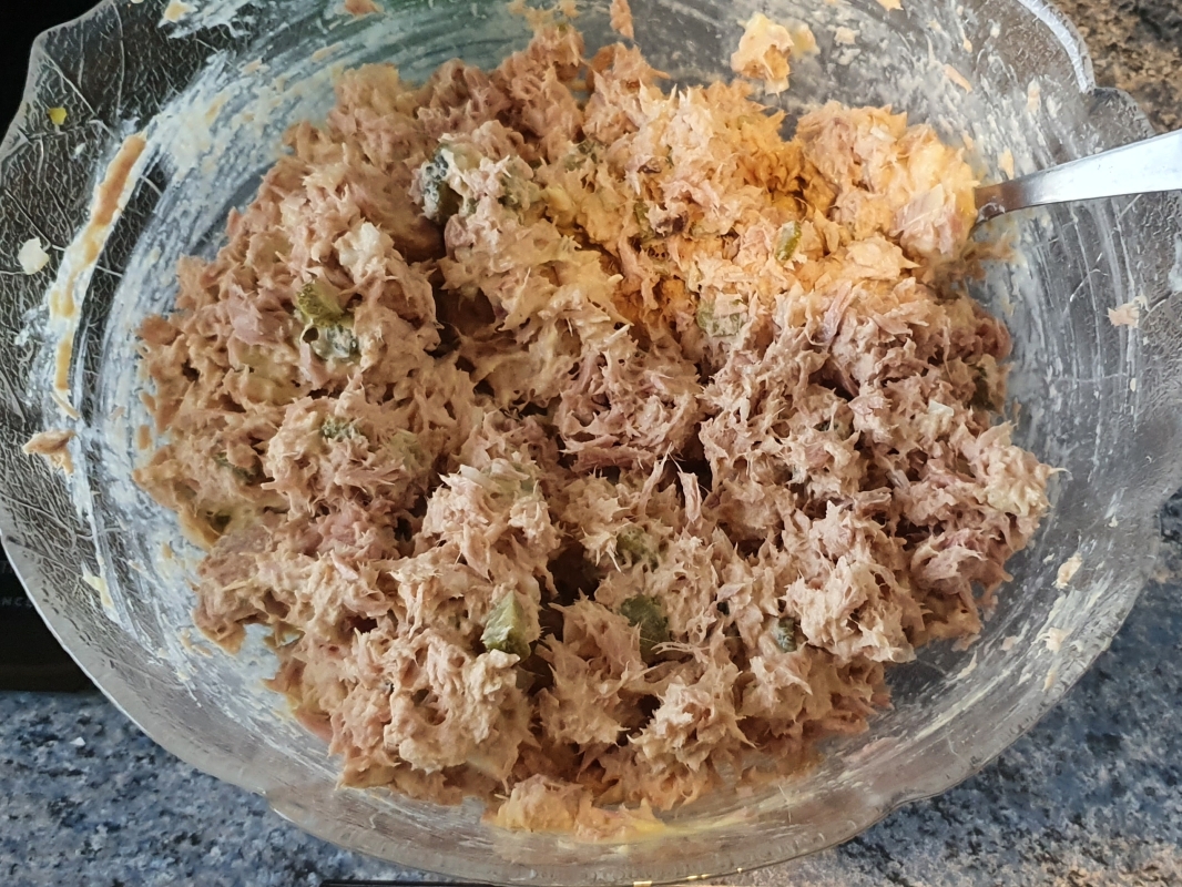 Vider une boite de thon et l'émietter. Ciseler 1 CS échalotes et 1 CS de cornichon. Mélanger le thon avec les 2 CS de mayonnaise, sel, échalotes, cornichon.
